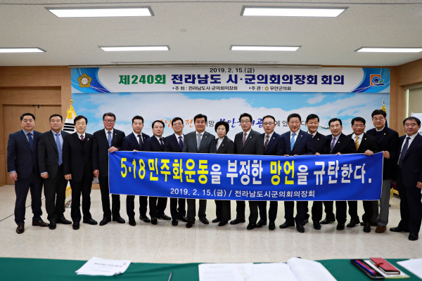 아울러 전남 시·군의회 의장회는 한국당 의원들의 5.18 민주화운동의 역사적 가치를 훼손한 망언에 대해 규탄하는 결의안을 긴급안건으로 상정하고 만장일치로 채택했다.