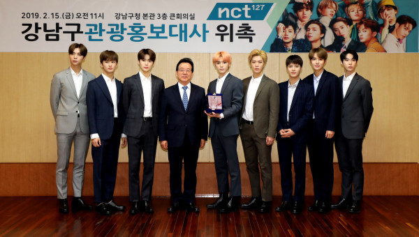 정순균 강남구청장이 지난 15일 구청 3층 큰회의실에서 ‘강남구 관광홍보대사 위촉식’을 개최하고 보이그룹‘NCT 127’을 관광홍보대사로 위촉했다. 사진은 위촉 후 함께 기념촬영을 하고 있는 정 구청장(왼쪽 네 번째)의 모습. (사진제공=강남구청)