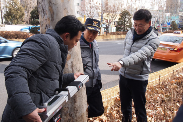 | ▲ 전영준 의원(왼쪽)이 관계자들과 함께 가로수의 내부 동공비율을 측정하고 있다. (사진제공=종로구의회) | ||