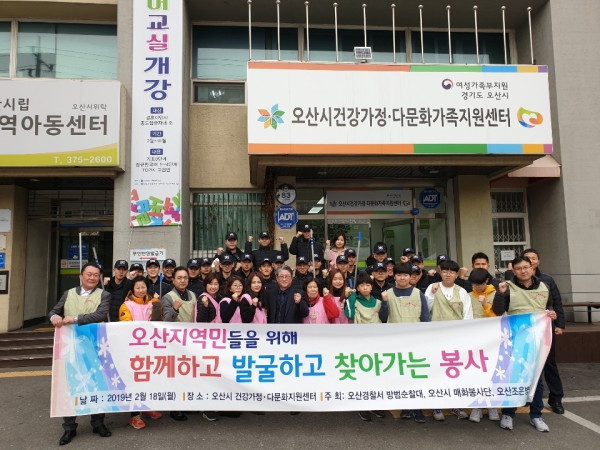 경기 오산시 경찰서 방범순찰대원들과 매화봉사단원들, 조은병원 봉사동아리 회원들은 18일 함께 건강가정·다문화가족센터를 방문해 봄맞이 대청소 봉사를 했다. 사진은 이날 봉사활동에 참여한 순찰대원 및 봉사단원들이 기념촬영을 하는 모습. (사진제공=오산시청)