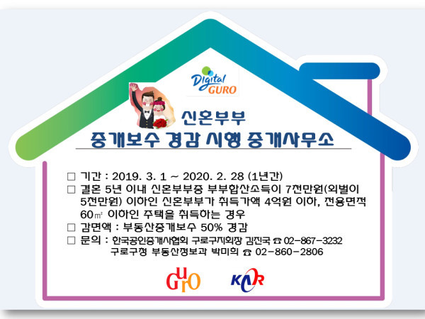 19일 구에 따르면 이 사업은 한국공인중개사협회 구로구지회의 지원을 받아 신혼부부가 처음으로 주택을 구입할 경우 부동산 중개보수를 50% 경감해 주는 것이다.
