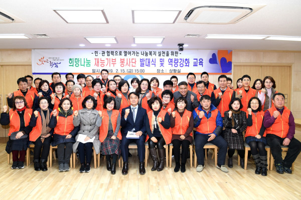 경기 하남시는 18일 시청 상황실에서 재능기부 봉사단 및 복지시설 시설장 등 60여명이 참석한 가운데 재능기부 봉사단 발대식을 개최했다. 사진은 발대식에서 김상호 시장(왼쪽에서 일곱번째)과 봉사단원들이 기념촬영을 하는 모습. (사진제공=하남시청)