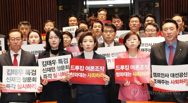 19일 국회에서 열린 자유한국당 의원총회에서 나경원 원내대표 등 참석자들이 김태우 특검과 신재민 청문회 등을 요구하며 구호를 외치고 있다.