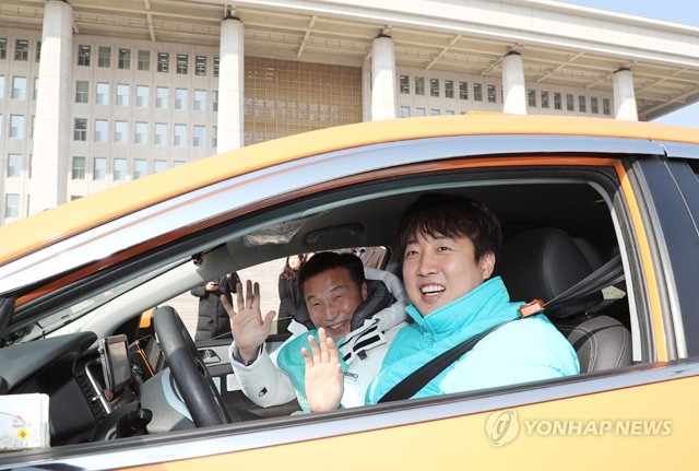 바른미래당 손학규 대표(왼쪽)가 21일 오후 국회 본청 앞에서 ‘손다방, 국민 속으로 민생의 바로미터 택시기사를 만나다’에 참석하기 위해 이준석 최고위원이 운전하는 택시에 탑승해 인천공항으로 향하고 있다.
