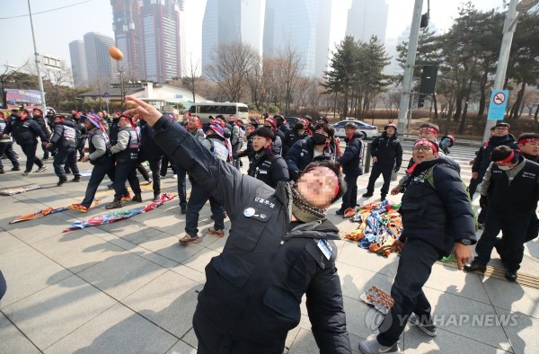 21일 서울 여의도 KDB 산업은행 앞에서 열린 전국금속노동조합 대우조선지회 확대간부 상경투쟁에서 참가자들이 산업은행의 대우조선 현대중공업 매각에 항의하며 계란을 던지고 있다.