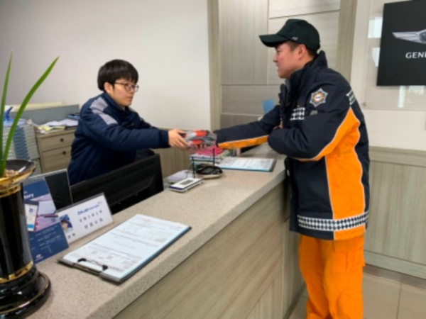 경기 이천소방서가 최근 지역내 자동차 검사소 16곳을 방문해 1차량 1소화기에 대한 홍보를 위해 차량용 소화기 관련 전단지 배부 및 안전교육을 실시했다. 사진은 검사소를 방문한 소방관이 안전교육을 실시하고 홍보 전단지를 배부하는 모습. (사진제공=이천시청)