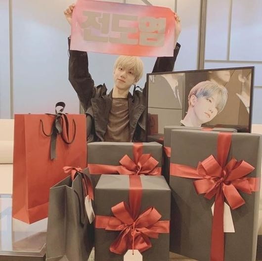 사진 속 전도염은 팬들이 보낸 선물과 액자, 자신의 이름이 적혀진 슬로건을 들고 카메라를 향해 밝게 웃고 있다. 그는 화장기 없는 얼굴에도 불구하고 훈훈한 비주얼을 드러내며 팬들을 설레게 했다.
