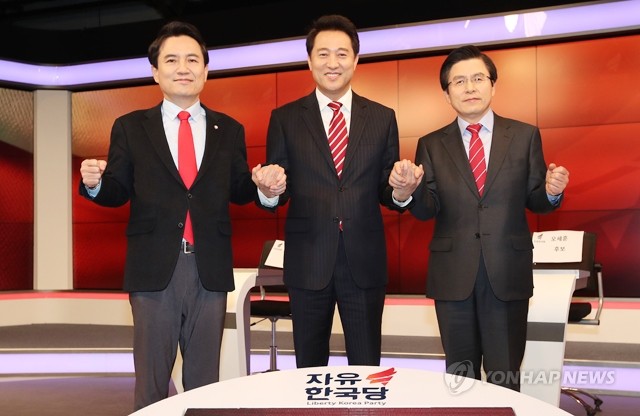 자유한국당 전당대회를 앞둔 김진태(왼쪽부터), 오세훈, 황교안 당대표 후보자가 23일 오전 서울 중구 매경미디어센터에서 열린 자유한국당 합동TV 토론회에 앞서 포즈를 취하고 있다.