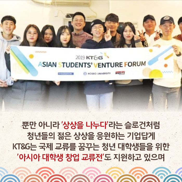 뿐만아니라 '상상을 나누다'라는 슬로건처럼 청년들의 젊은 상상을 응원하는 기업답게 KT&G는 국제 교류를 꿈꾸는 청년 대학생들을 위한 '아시아 대학생 창업 교류전'도 지원하고 있으며