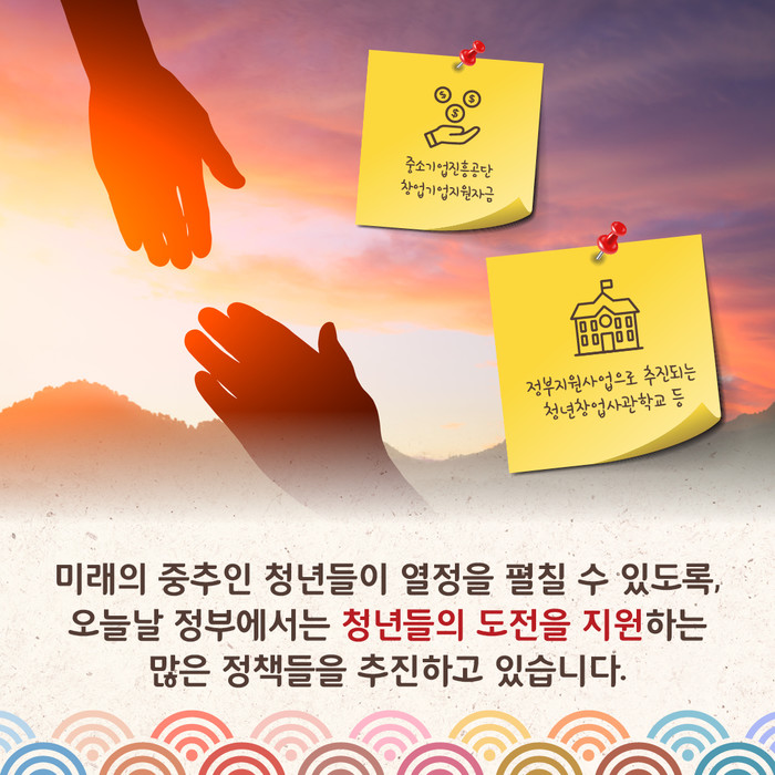 미래의 중추인 청년들이 열정을 펼칠 수 있도록, 오늘날 정부에서는 청년들의 도전을 지원하는 많은 정책들을 추진하고 있습니다.