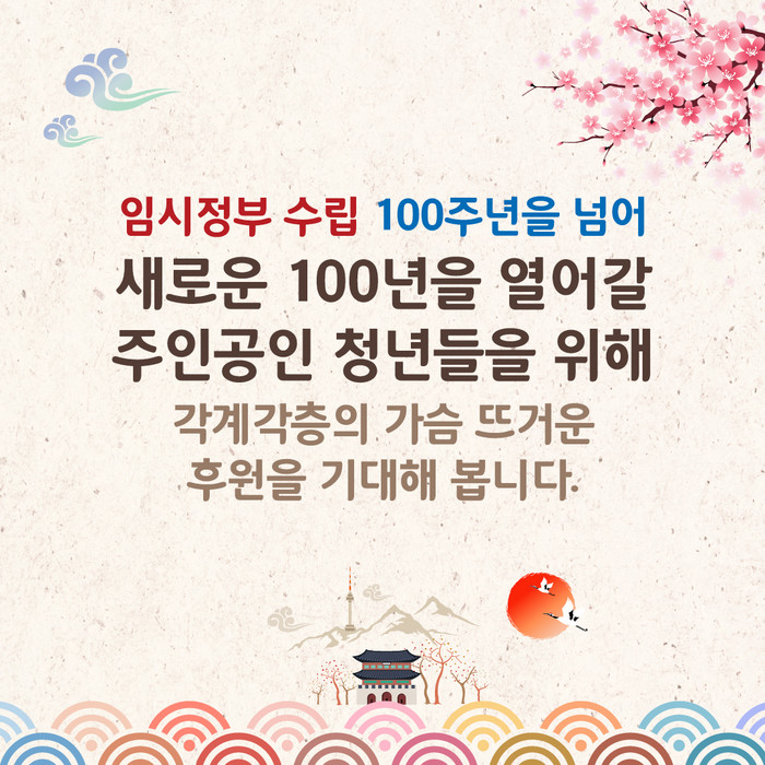 임시정부 수립 100주년을 넘어 새로운 100년을 열어갈 주인공인 청년들을 위해 각계각층의 가슴 뜨거운 후원을 기대해 봅니다.