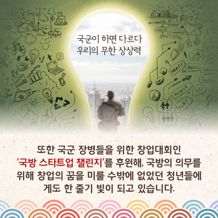 또한 국군 장병들을 위한 창업대회인 '국방 스타트업 챌린지'를 후원해, 국방의 의무를 위해 창업의 꿈을 미룰 수밖에 없었던 청년들에게도 한 줄기 빛이 되고 있습니다.