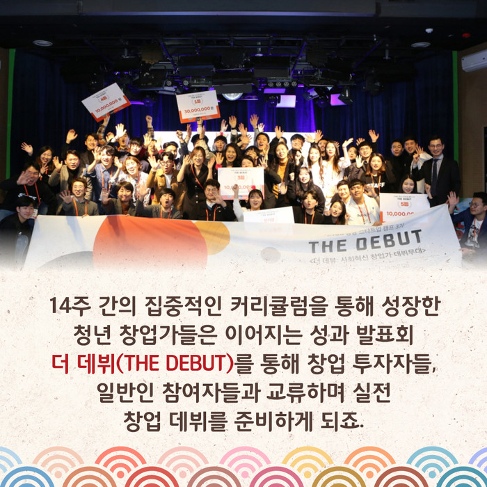 14주 간의 집중적인 커리큘럼을 통해 성장한 청년 창업가들은 이어지는 성과 발표회 더 데뷔(THE DEBUT)를 통해 창업 투자자들, 일반인 참여자들과 교류하며 실전 창업 데뷔를 준비하게 되죠.