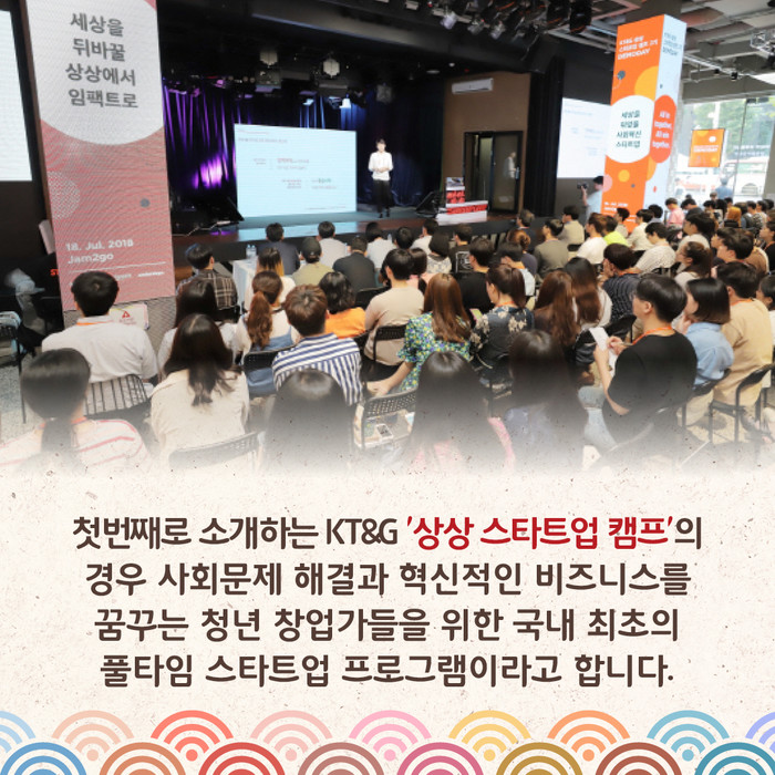 첫번째로 소개하는 KT&G '상상스타트업 캠프'의 경우 사회문제 해결과 혁신적인 비즈니스를 꿈꾸는 청년 창업가들을 위한 국내 최초의 풀타임 스타트업 프로그램이라고 합니다.