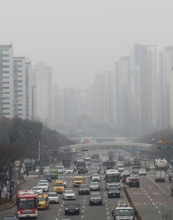 초미세먼지 주의보가 발령 중인 25일 오전 경기 수원시 영통구 봉영로가 뿌옇다.