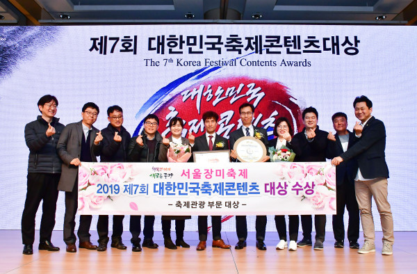지난 22일 서울시와 한국관광공사 등이 공식 후원하는 '2019 대한민국 축제콘텐츠 대상' 축제관광부문에서 중랑구 '서울장미축제'가 대상을 수상했다. 사진은 시상식에 참석한 이수연 부구청장(오른쪽 다섯번째) 및 구청 직원들이 기념촬영을 하는 모습. (사진제공=중랑구청)