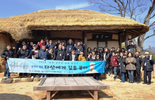 서울 용산구가 최근 직원 45명을 대상으로 ‘다산에게 길을 묻다’ 유적지 탐방 교육을 실시했다. 현장에서 이뤄진 이번 교육에서는 다산의 생가, 초당, 사의재 등을 견학했다. 사진은 사의재를 둘러본 구청 직원들이 기념촬영을 하는 모습. (사진제공=용산구청)
