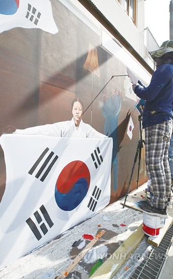 3.1절 100주년을 나흘 앞둔 25일 서울 종로구 돈의문박물관마을에서 박물관 관계자들이 백범 김구, 유관순 열사, 윤봉길 의사 등 독립운동가 벽화를 그리고 있다.