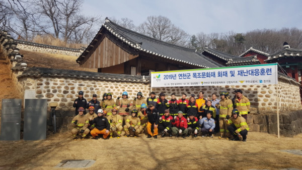 경기 연천군과 연천소방서는 25~26일 양일간 목조문화재 현장에서 화재 대응능력 강화를 위해 소방차 등 8대의 장비와 80명의 인원이 참여한 가운데 합동 소방훈련을 실시했다. 사진은 소방 훈련 후 관계자들이 기념촬영을 하고 있는 모습. (사진제공=연천군청)