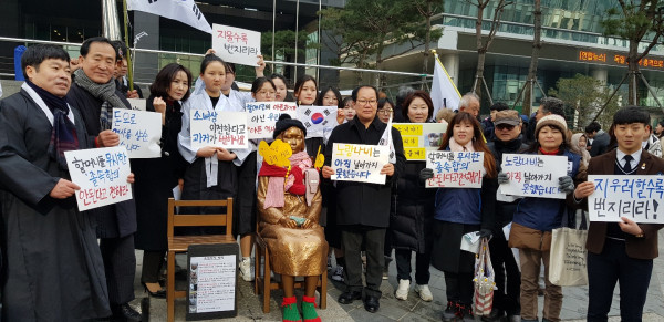 | ▲ 독도향우회 경기도지회와 경기도의원, 지역 청소년들이 일본대사관 '평화의 소녀상' 앞에 모여 일본의 독도 망언 철회와 함께 '다케시마의 날' 폐지를 촉구하고 있다. (사진제공=경기도의회) | ||
