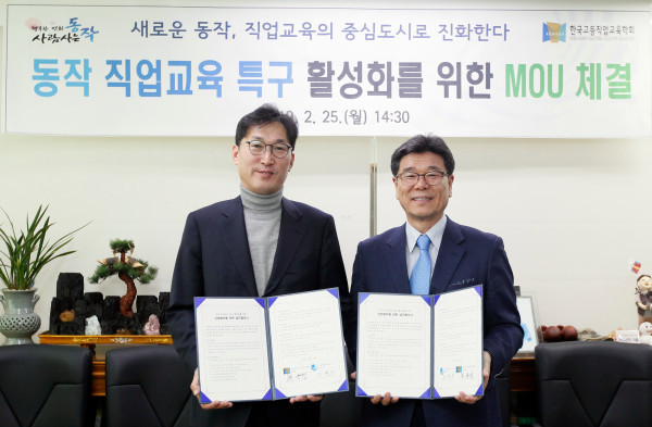서울 동작구는 25일 ‘사단법인 한국고등직업교육학회’와 동작 직업교육 특구 활성화를 위한 업무협약을 체결했다. 사진은 이창우 구청장(왼쪽)과 최용섭 한국고등직업학회 학회장이 협약서를 들고 기념촬영을 하는 모습. (사진제공=동작구청)