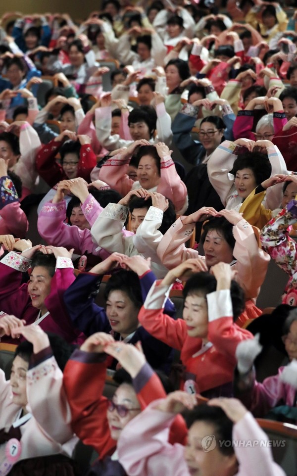 26일 오전 마포구 마포아트센터에서 열린 일성여자중고등학교 2018학년도 졸업식에서 한복을 차려입은 졸업생들이 교장 선생님과 내빈들을 향해 두 팔로 하트를 만들어 보이고 있다.