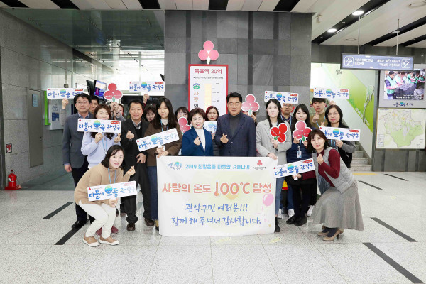 관악구가 최근 ‘2019 희망온돌 따뜻한 겨울나기’ 사업의 일환으로 시작된 ‘사랑의 온도 100℃’에서 목표액 20억을 초과 달성했다. 사진은 박준희 구청장이 관계직원들과 구청 1층 사랑의 온도 탑 앞에서 기념 촬영을 하는 모습. (사진제공=관악구청)