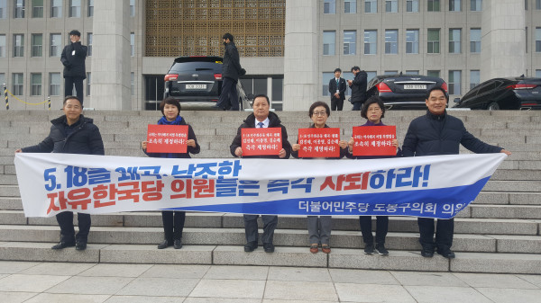 [시민일보=황혜빈 기자] 서울 도봉구의회(의장 이성희) 더불어민주당 소속 김기순·박진식·유기훈·이길연·이영숙 이태용 의원 6명이 최근 국회 본관 앞에서 열린 ‘5.18 광주 모독 망언 규탄 및 망언 의원 제명 촉구대회’에 참석했다.