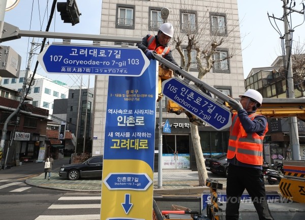 27일 오전 성북구청 바람마당 앞의 '인촌로 7길' 도로 명판이 '고려대로 7길'명판으로 교체되고 있다. 김성수의 친일행위가 2017년 대법원에서 인정되고 정부가 건국훈장도 박탈함에 따라 성북구는 주민 동의를 받아 인촌로를 고려대로로 바꾸고 지난해 12월24일 이를 고시했다.