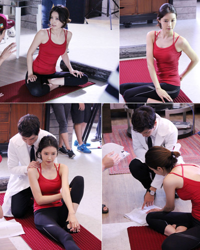 공개된 SBS 수목드라마 `용팔이` 촬영현장 사진 속 채정안은 아찔한 몸매가 드러난 빨간색과 검정색의 요가복을 입고 열심히 촬영에 임하고 있다. 앞서 채정안은 의도적으로 주원에게 접근해 김태희를 만나려고 한 바 있다.