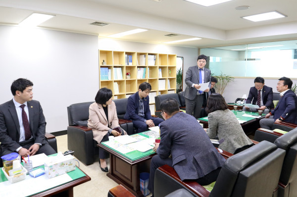 | ▲ 서울시의회를 방문한 이관수 의장이 서울시의회 교통위원회 의원들에게 설명하고 있다. (사진제공=강남구의회) | ||