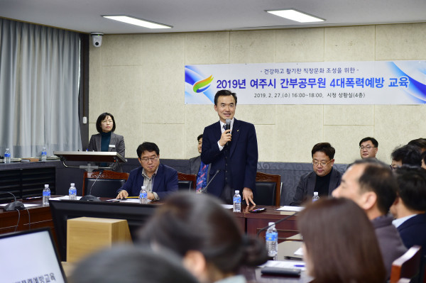 경기 여주시는 최근 시청 상황실에서 5급 이상 간부공무원을 대상으로 ‘4대 폭력예방 교육’을 실시했다. 이날 교육은 이항진 시장을 비롯해 50여명의 간부공무원이 참석한 가운데 진행됐다. 사진은 이 시장이 교육을 받은 후 소감을 전하는 모습. (사진제공=여주시청)
