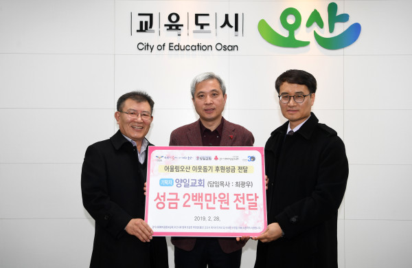 경기 오산시는 28일 양일교회로부터 이웃돕기 성급 200만원을 기탁 받았다. 이날 전달된 성금은 경기사회복지공동모금회를 통해 지역내 저소득층에게 사용될 예정이다. 사진은 곽상욱 시장(가운데)이 성금을 전달받고 관계자들과 기념촬영을 하는 모습. (사진제공=오산시청)