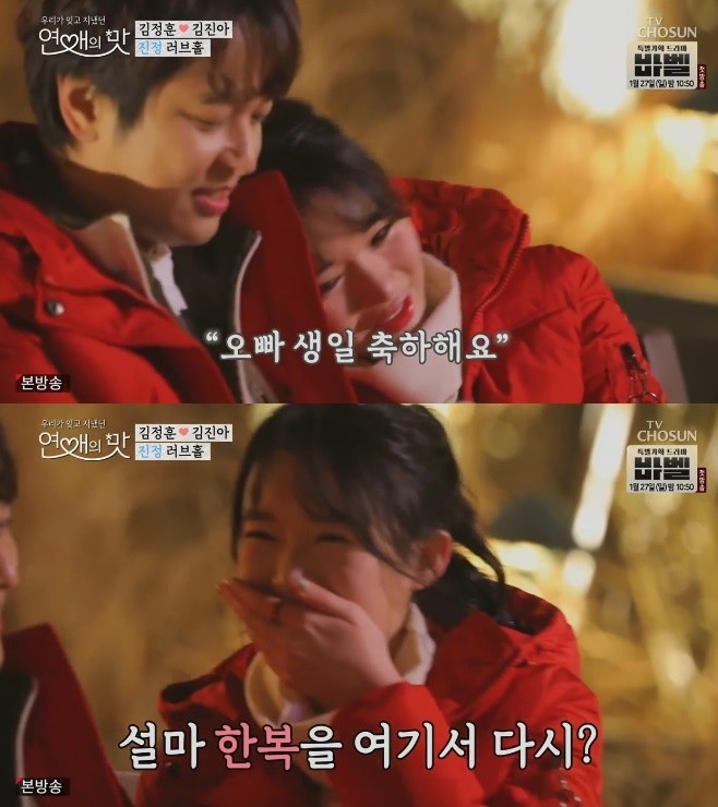 이후 김진아는 생일인 김정훈을 위해 직접 쓴 편지를 전했다. 이에 김진아는 "내 인생에 특별한 추억을 만들어줘서 고맙다"고 말한 뒤 김정훈의 어깨의 살짝 기대 "생일축하한다"고 말해 눈길을 끌었다.