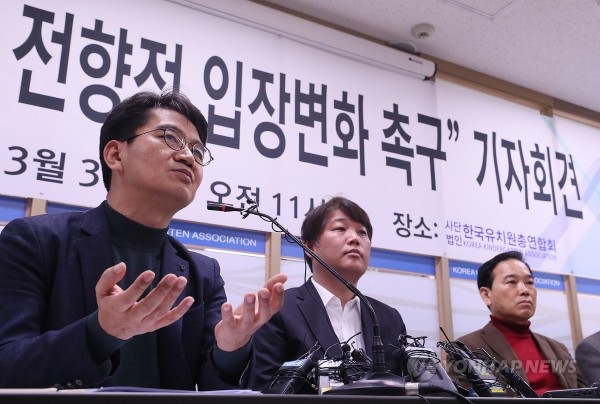 이덕선 한국유치원단체총연합회(한유총) 이사장(왼쪽)이 3일 오전 서울 용산구 한유총 사무실에서 기자회견을 열고 유치원 개학연기와 관련 정부의 대응에 대한 입장을 발표한 뒤 취재진의 질문에 답하고 있다.