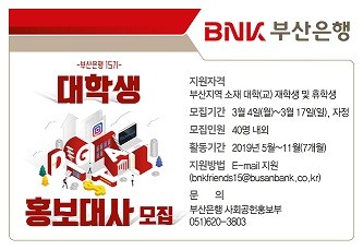 지원서 접수는 3월 17일 자정까지 부산은행 홈페이지(www.busanbank.co.kr)에서 지원서를 다운로드 받아 이메일 (bnkfriends15@busanbank.co.kr)을 통해 접수하면 된다.