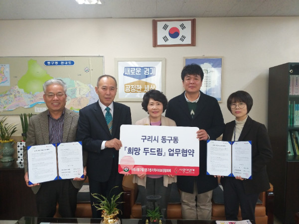 경기 구리시 동구동은 최근 행정복지센터에서 동 지역사회보장협의체, 행정복지센터, 경기 사회복지공동모금회와 함께 지역내 복지 사각지대 해소를 위한 ‘희망 두드림 사업’에 대한 업무 협약을 체결했다. 사진은 관계자들이 기념촬영 하는 모습. (사진제공=구리시청)