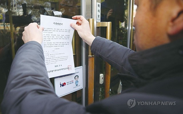 한국유치원총연합회(한유총)가 ‘유치원 3법’ 등 철회를 요구하며 ‘개학 연기 투쟁’에 나선 4일 오전 개학 연기 여부에 대해 무응답한 서울 도봉구의 한 유치원에서 서울북부교육지원청 장학사가 시정명령서를 부착하고 있다.