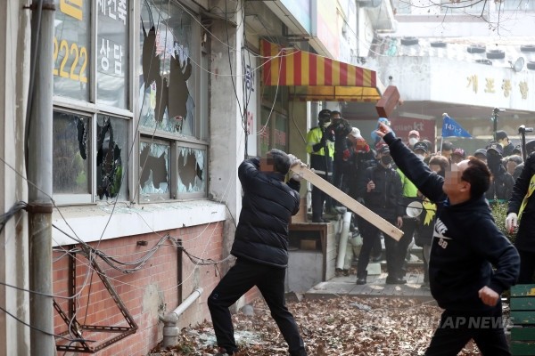 4일 오전 명도소송강제집행이 시도된 서울 개포종합상가 앞에서 개포주공 1단지 재건축 조합원들이 상가 유리창을 부수고 있다.