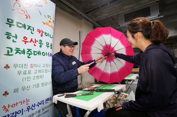 서울 동대문구는 오는 10월31일까지 ‘찾아가는 칼갈이·우산수리센터’를 운영한다. 총 8개월간 정비반이 14개동 주민센터를 차례로 순회하며 고장난 우산과 무뎌진 칼을 무료로 수리한다. 사진은 4일 용신동 주민센터에서 ‘찾아가는 칼갈이·우산수리센터’ 정비반이 고장난 우산을 수리하고 있는 모습. (사진제공=동대문구청)