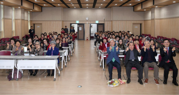 4일 경기 오산노인종합복지관에서 운영하는 노인대학 개강식이 열렸다. 올해로 운영 3년째를 맞는 시니어아카데미는 세교복지타운(수청로 192) 4층 강당에서 운영하고 매주 월요일 수준 높은 인문학 및 각종 교양 강좌가 열려 노인들의 큰 호응을 얻고 있다. 사진은 곽상욱 오산시장 및 참여자들이 기념촬영을 하는 모습. (사진제공=오산시청)