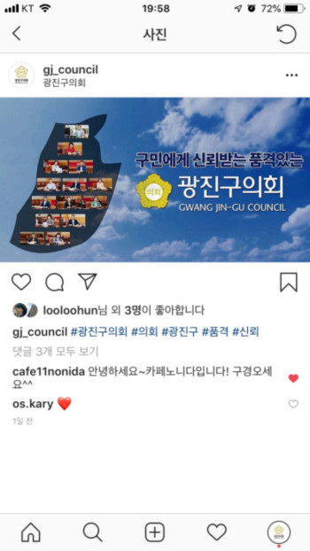 한편, 이달부터 본격적으로 운영되는 구의회 SNS는 네이버 블로그·페이스북·인스타그램·유튜브에서 '광진구의회'를 검색하면 구의회에 관한 정보를 한 눈에 볼 수 있으며, 개별의원에 대한 홍보는 게시하지 않는다.