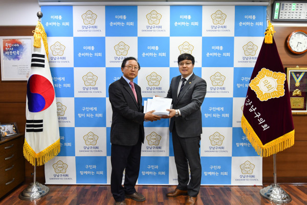 이관수 서울 강남구의장이 5일 구의회를 방문한 위례·과천선 비상대책위원회 주민들로부터 ‘위례·과천선 4개 자치구 합의안’ 재검토를 요청하는 주민청원서를 접수받았다. 사진은 위례·과천선 비상대책위원회 김영찰 위원장으로부터 청원서와 주민 1만5000여명의 서명부를 전달받고 있는 이 의장(오른쪽)의 모습. (사진제공=강남구의회)