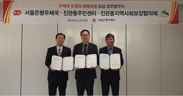 서울 은평구 진관동은 최근 은평우체국에서 저소득 주민의 의료비 보장 및 안정적인 생활 지원을 위해 동주민센터, 우체국 ,동지역사회보장협의체와 ‘만원의 행복’ 보험 지원 업무 협약을 체결했다. 사진은 관계자들이 협약서를 들고 기념촬영 하는 모습. (사진제공=은평구청)