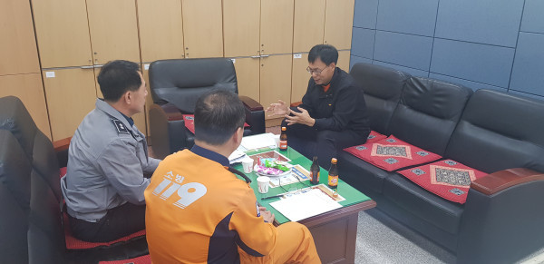 전남 영광소방서와 영광경찰서는 6일 오전 소방서 소회의실에서 2019년도 1분기 소방·경찰 공동대응 간담회를 개최했다. 이번 간담회에서는 각종 사건·사고 발생 시 실질적인 공동대응 방안에 대해 논의했다. 사진은 관계자들의 회의 진행 모습. (사진제공=영광소방서)