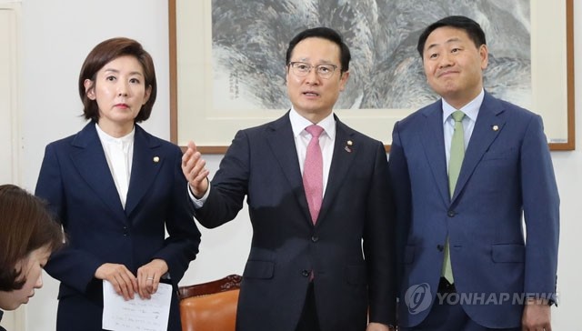 더불어민주당 홍영표(가운데)·자유한국당 나경원·바른미래당 김관영 원내대표가 6일 오후 국회 운영위원장실에서 긴급회동을 마치고 미세먼지를 국가재난사태에 포함하는 등의 내용을 골자로 하는 미세먼지 관련 법안을 오는 13일 국회 본회의에서 처리하기로 했다고 발표하고 있다.