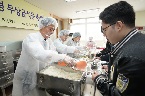 서울 성북구가 지난 5일 용문고등학교에서 ‘고등학교 친환경 무상급식 확대 실시 기념 배식행사’를 개최했다. 이날 행사에는 이승로 구청장 및 진영남 교장, 학부모 대표 박순정씨가 참여했다. 사진은 이 구청장이 학생들에게 밥을 배식하는 모습. (사진제공=성북구청)