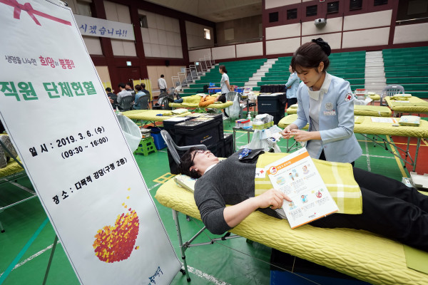 동대문구는 6일 구청 다목적강당에서 대한적십자사 동부혈액원 주관으로 ‘2019년 직원 단체헌혈’을 실시했다. 이날 행사에는 ▲구청·동주민센터·공단 직원 ▲사회복무요원 등 총 150여명이 자발적으로 참여해 수혈이 필요한 이들을 위해 헌혈하며 생명나눔을 몸소 실천했다. 사진은 참여자들이 헌혈을 하고 있는 모습. (사진제공=동대문구청)