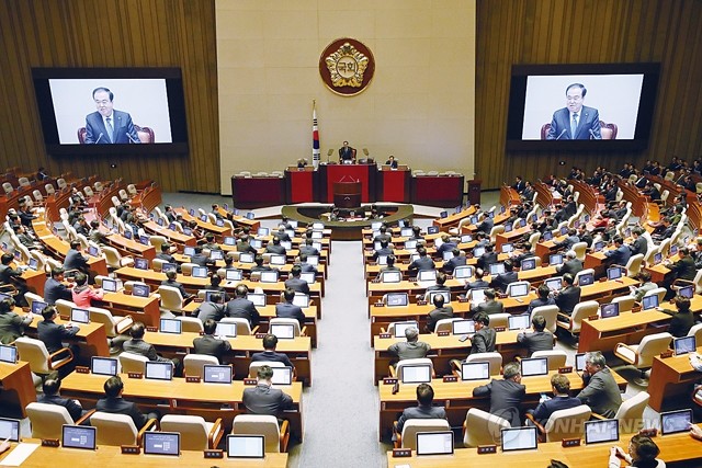 문희상 국회의장이 7일 오후 국회 본회의장에서 열린 제367회 임시회 개회식에서 개회사를 하고 있다. 이날 이후 30일간 열리게 되는 3월 임시국회에서 여야는 미세먼지 대책을 가장 먼저 다룰 예정이다.