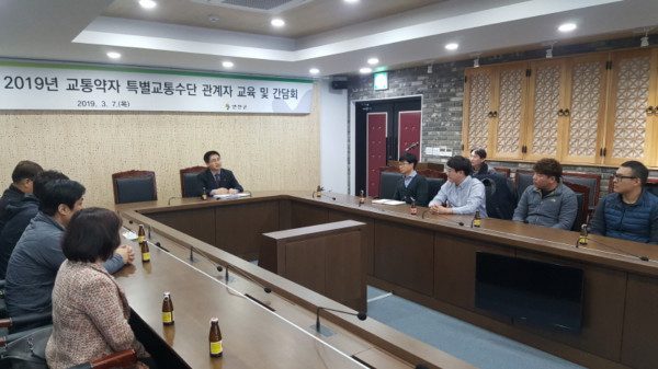 경기 연천군은 7일 본관 상황실에서 지역경제과장 주재로 시설관리공단 및 교통약자 특별교통수단 운전원 등 16명의 관계자가 참석해 ‘2019년 연천군 교통약자 특별교통수단 관계자 교육 및 간담회’를 개최했다. 사진은 회의 진행 모습. (사진제공=연천군청)